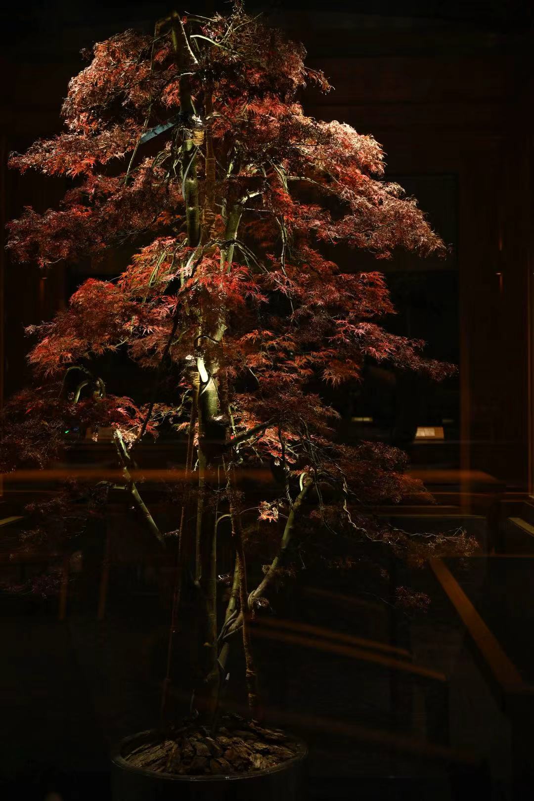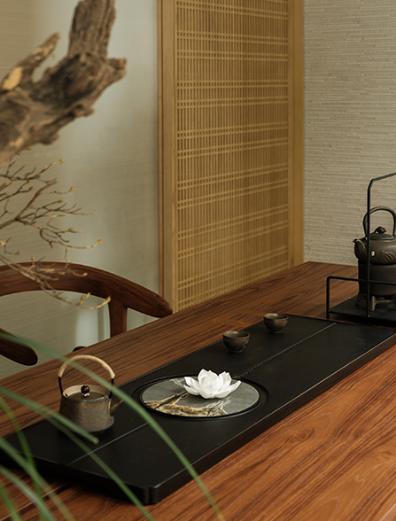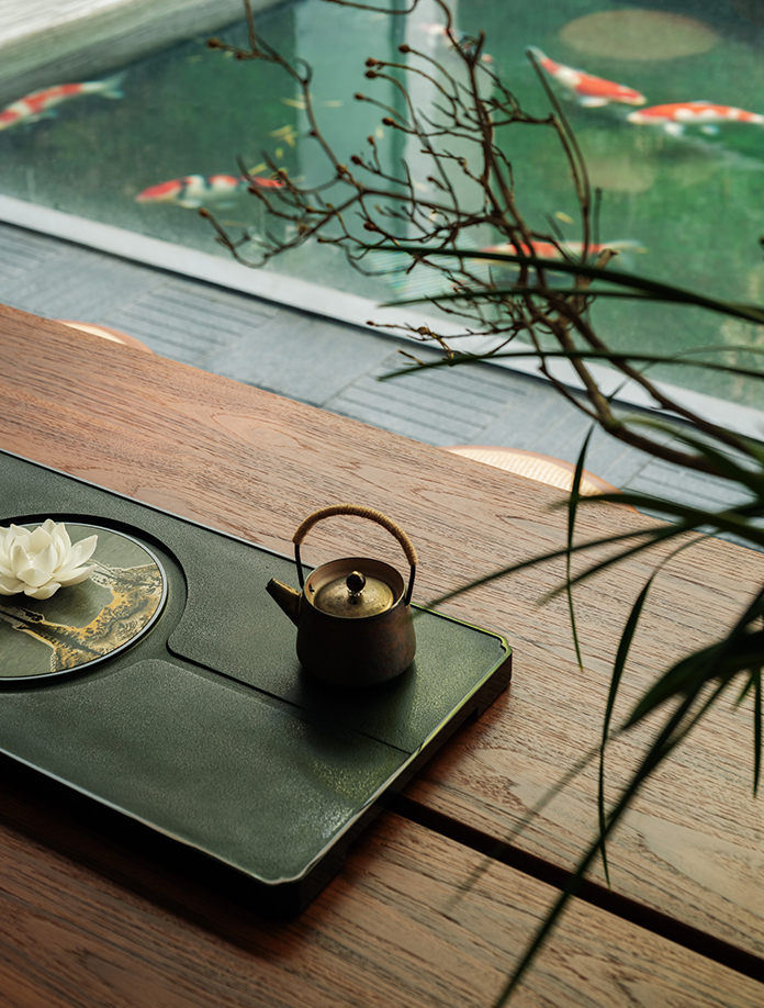 空间以一面玻璃为界,一边是碧波荡漾的锦鲤池,数十尾锦鲤在水中缓缓曳尾。金红与素白的光斑,像一卷会呼吸的古典丝绸,温柔地铺展、收拢。右侧,是临池而设的饮茶区,空间以温润的木质为基调,一方修长的茶桌静卧其中。