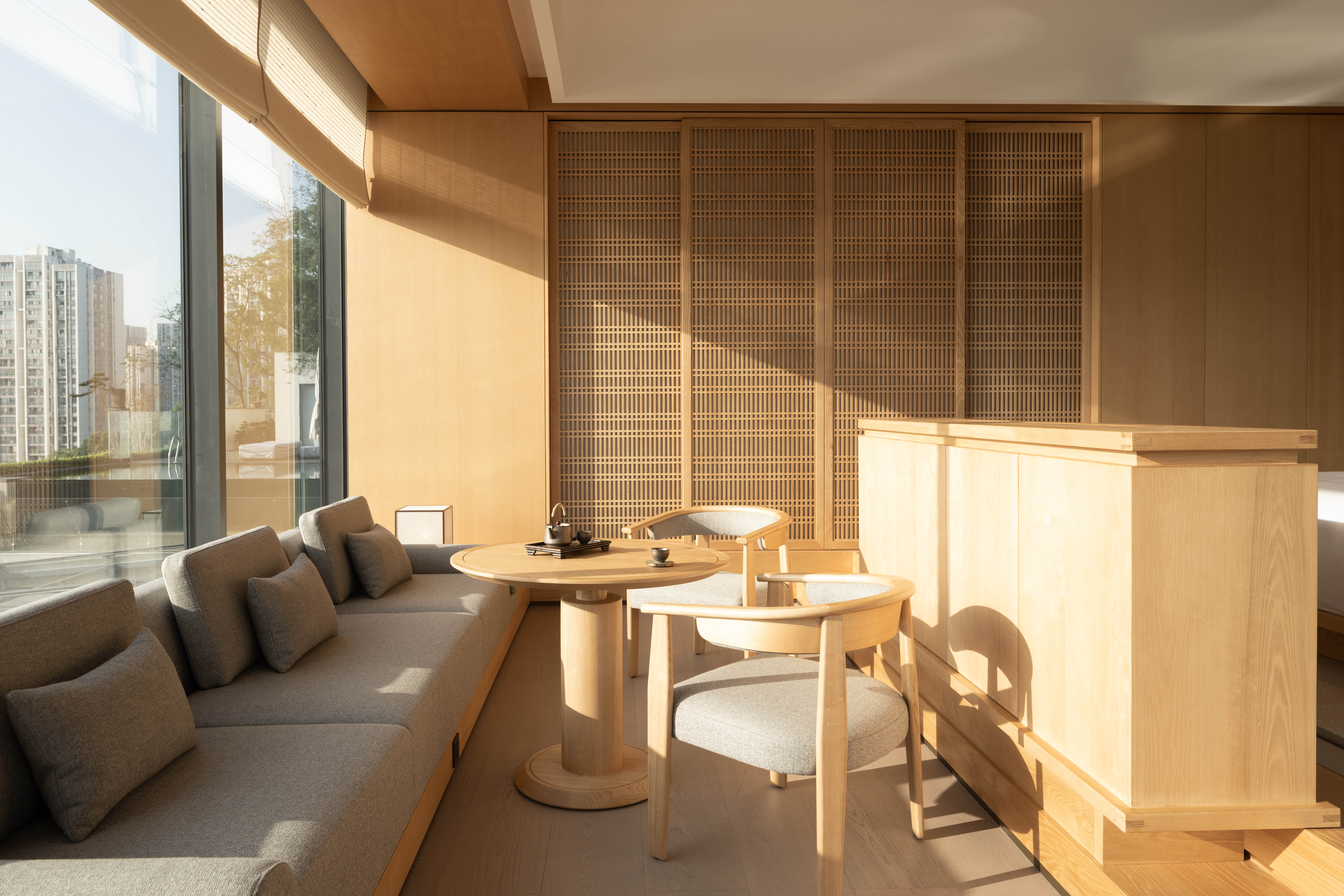 房间中央特别设计一处下沉式饮茶区域,烹水煮茶,在城市的喧嚣之上,开辟一方禅意与宁静的自在地。宽敞的盥洗室内,配备双人位独立洗漱台。临窗而设的独立浴缸,目光所及便是窗外连绵的城景。