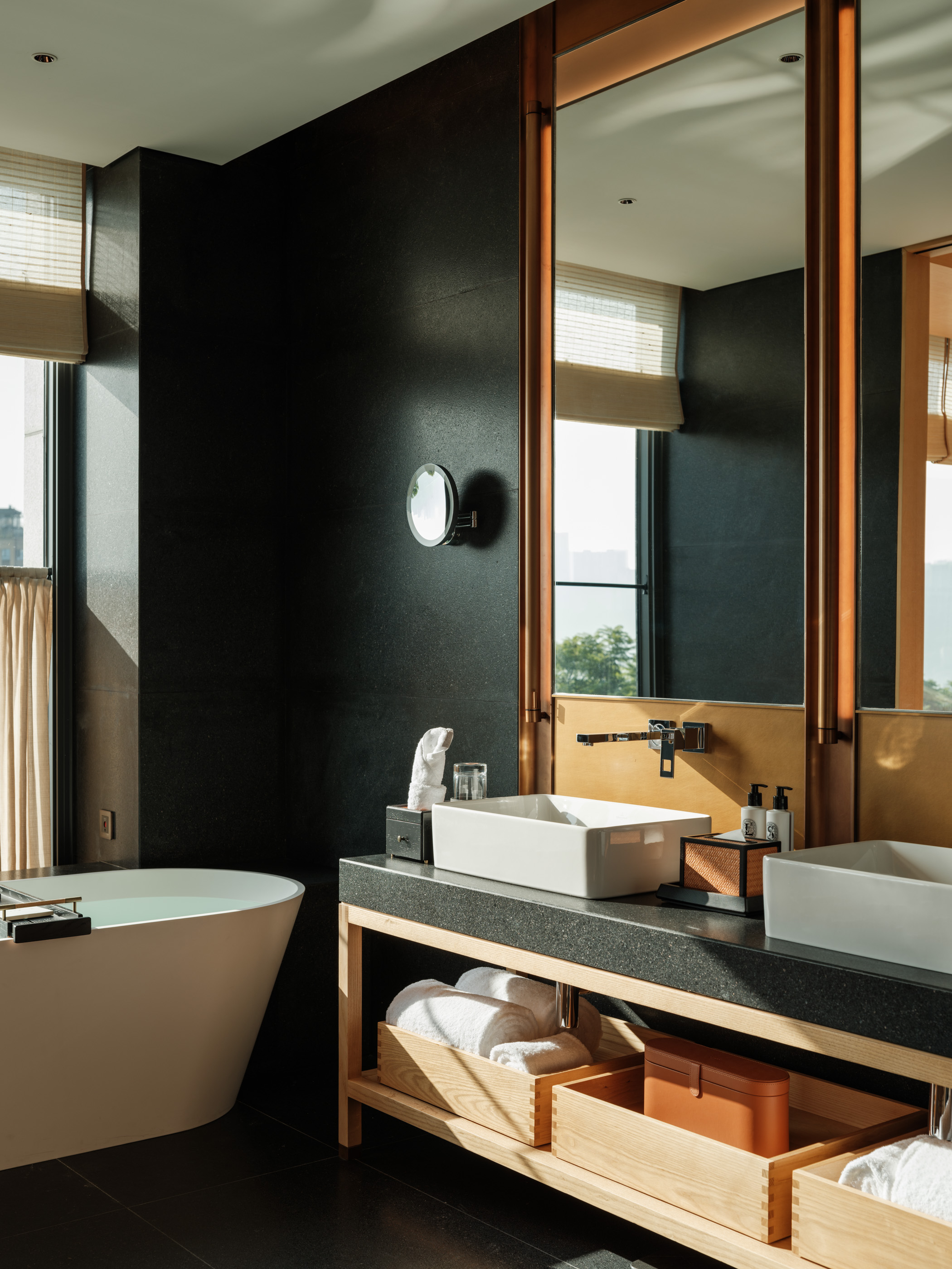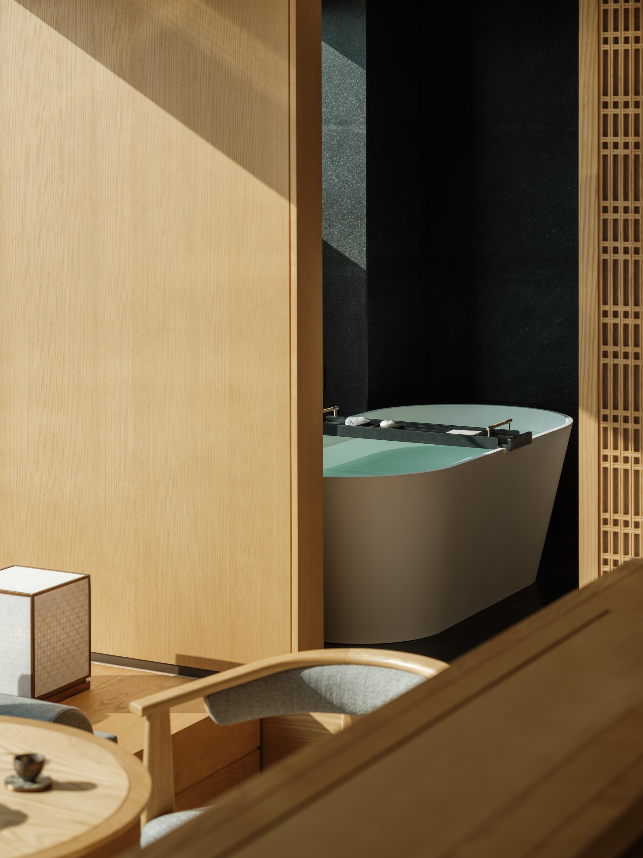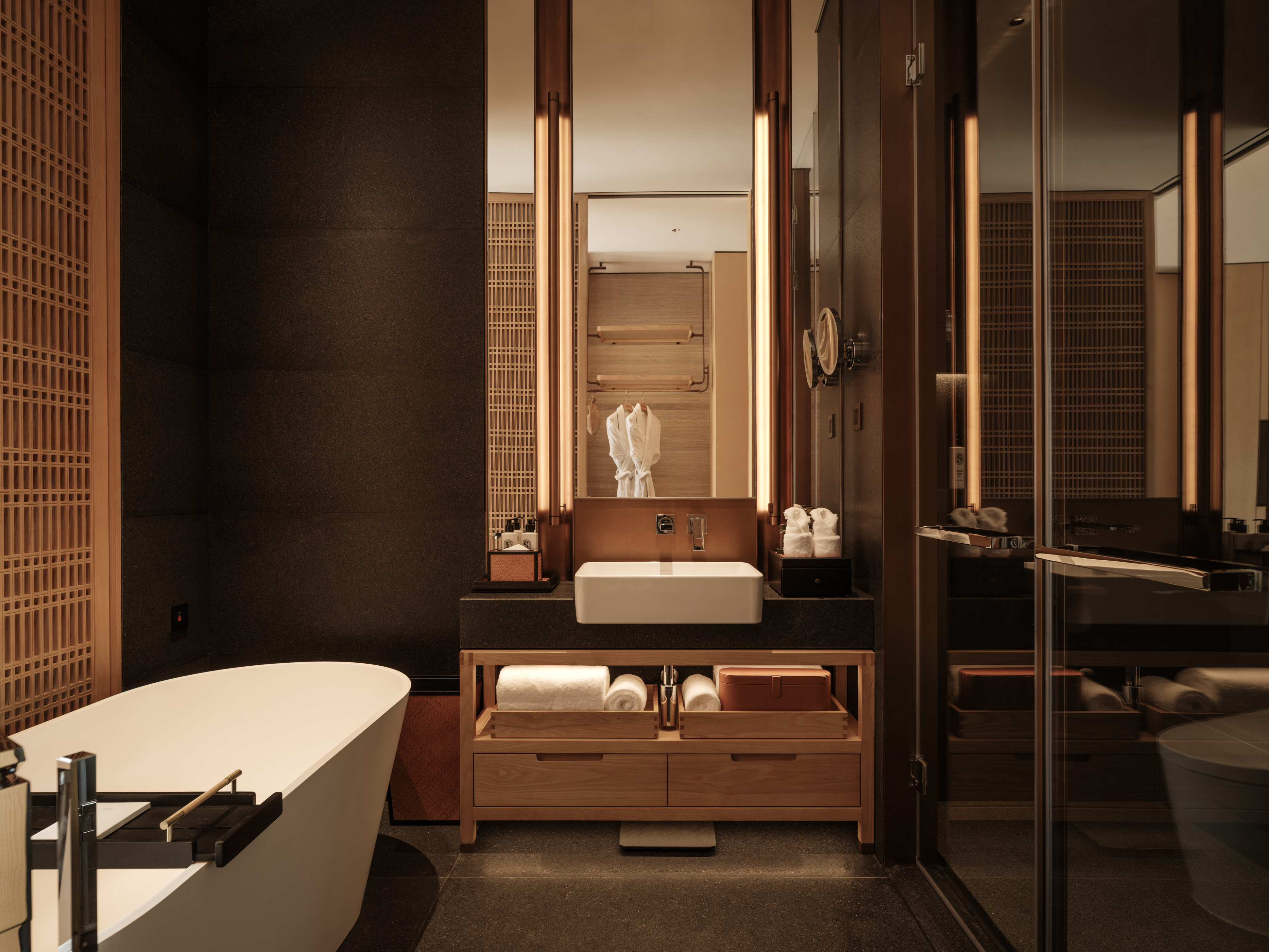 赤足温润的卫生间地暖与独立浴缸、高品质卫浴设备共同营造出一个温暖、私密、可彻底放松身心的沐浴空间。